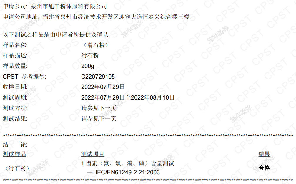 我司已連續(xù)多年將自身滑石粉送至第三方檢測(cè)機(jī)構(gòu)進(jìn)行鹵素含量測(cè)定,產(chǎn)品各項(xiàng)指標(biāo)均可滿足標(biāo)準(zhǔn)要求,客戶可放心使用,具體檢測(cè)結(jié)果見下表。