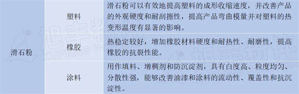 滑石具有潤(rùn)滑性、耐酸堿性、絕緣性、熔點(diǎn)高、遮蓋力良好、光澤好、吸附力強(qiáng)等優(yōu)良的物理、化學(xué)特性。在塑料、橡膠、造紙、油漆等行業(yè)有著廣泛的應(yīng)用。