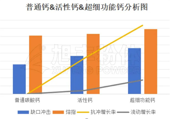 以下為經(jīng)過改性后超細(xì)功能碳酸鈣與普通碳酸鈣和活性鈣的力學(xué)性能差異性,超細(xì)功能碳酸鈣在抗沖性能與流動(dòng)性方面相比普通碳酸鈣有明顯優(yōu)勢(shì)。在滿足性能的前提下,可減少配方體系中POE添加量,降低配方綜合成本。