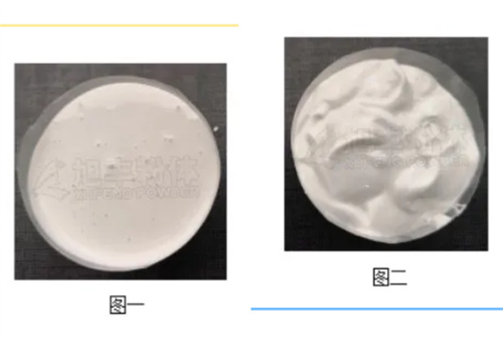 由于(攪拌或搖動(dòng))其粘度即降低的流動(dòng)性質(zhì),稱為觸變性??梢酝ㄟ^粉體表面改性提高涂料體系的觸變值。由于有觸變特性,當(dāng)涂刷較厚時(shí)不會(huì)出現(xiàn)流掛現(xiàn)象,同時(shí)有儲(chǔ)存穩(wěn)定性好等優(yōu)點(diǎn)。(以下為改性前后的數(shù)據(jù)對(duì)比,圖一為1250目重鈣,圖二為DXC系列改性粉體)